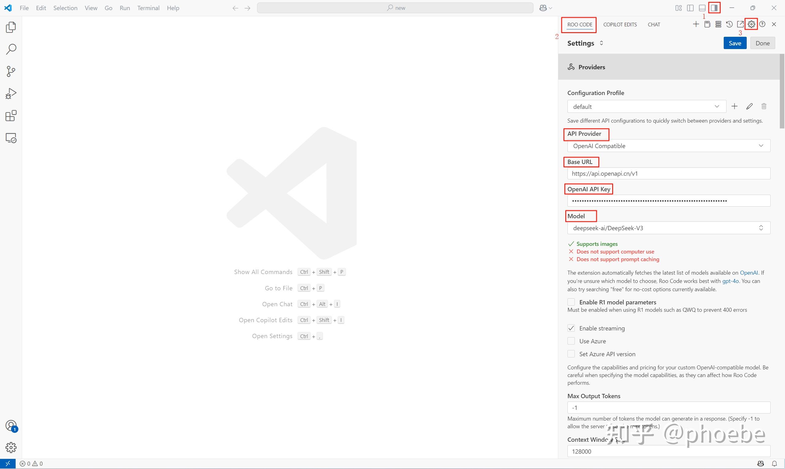 安装完成后,重启VS Code,按照截图中的1、2、3步骤点击按钮进入CLine的配置界面,CLine支持各种主流模型,大家可以选择 通义千问、深度求索、布尔算力 等任意平台,示例中选择了 布尔算力 平台,该平台免费赠送 2000W Tokens免费算力,可以快速体验CLine带来的AI辅助编程体验,API Provider选择 OpenAI Compatible,Base URL填写对应的 API地址,OpenAI API Key填写对应平台的 API Key,Model优先选择 deepseek/DeepSeek-V3,想要选择 deepseek/DeepSeek-R1也是可以的。