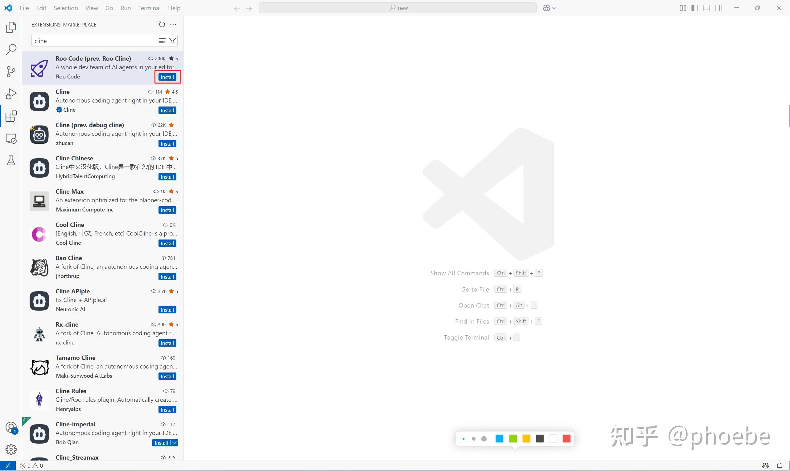 打开VS Code插件市场,搜索cline,会搜到很多CLine工具,基本上都差不多,随便选一个使用,教程就选第一个Roo Code作为示例,点击旁边的install按钮进行安装。