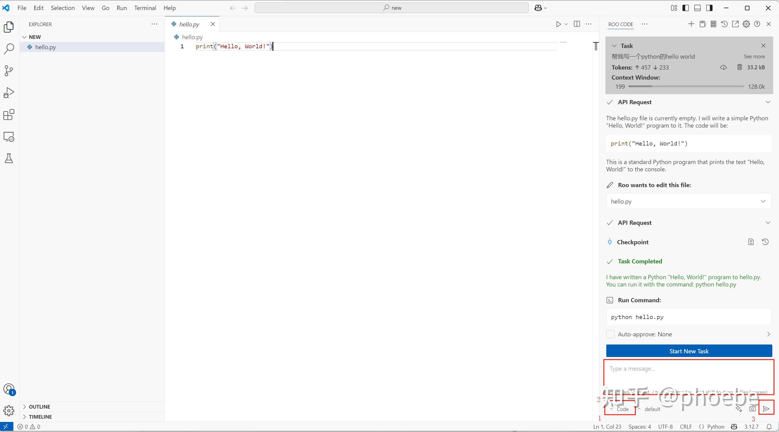 配置完成后用户可以参考截图中的1、2、3步骤进行需求描述,步骤1选择Code模型,步骤2描述功能需求,步骤3提交任务,CLine会结合当前环境和项目,读取项目已有代码,编写新的功能代码,并自动插入到合适的文件和位置,完成我们的开发需求任务。