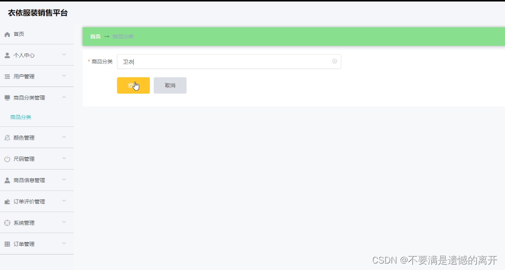 本“衣依”服装销售平台管理员功能有管理员和用户两个角色。管理员有个人中心,用户管理,商品分类管理,颜色管理,尺码管理,商品信息管理,订单评价管理,系统管理,订单管理。用户可以注册登录,登录后在前台首页可以查看商品信息,商品资讯,在个人中心可以修改个人资料,查看我的订单,我的地址,我的收藏等信息,后台管理可以查看自己的订单。因而具有一定的实用性。