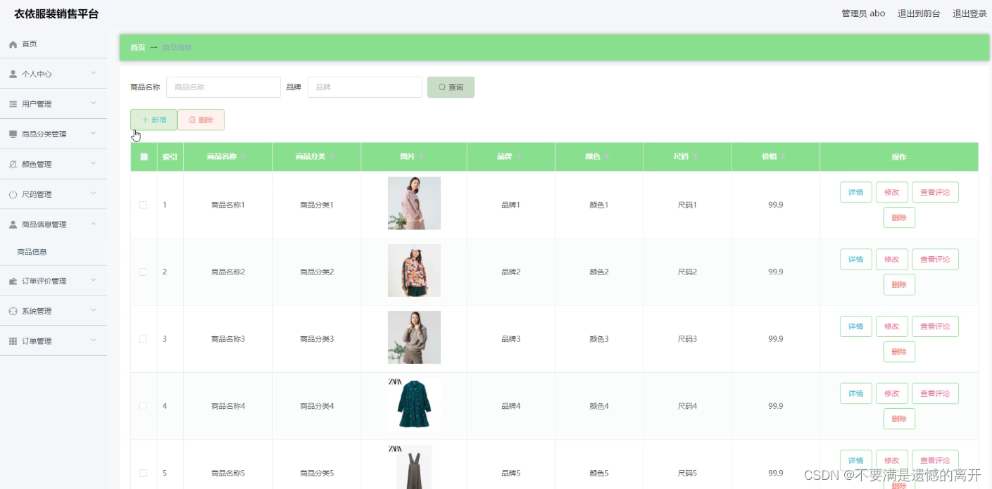 服装销售平台的系统管理员可以管理员商品,可以对商品信息添加修改删除操作。