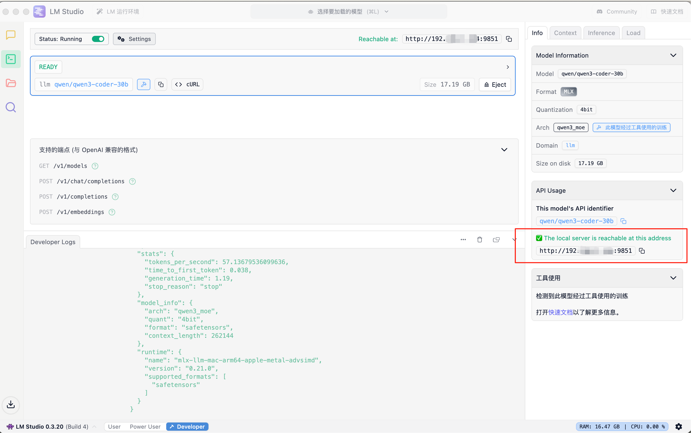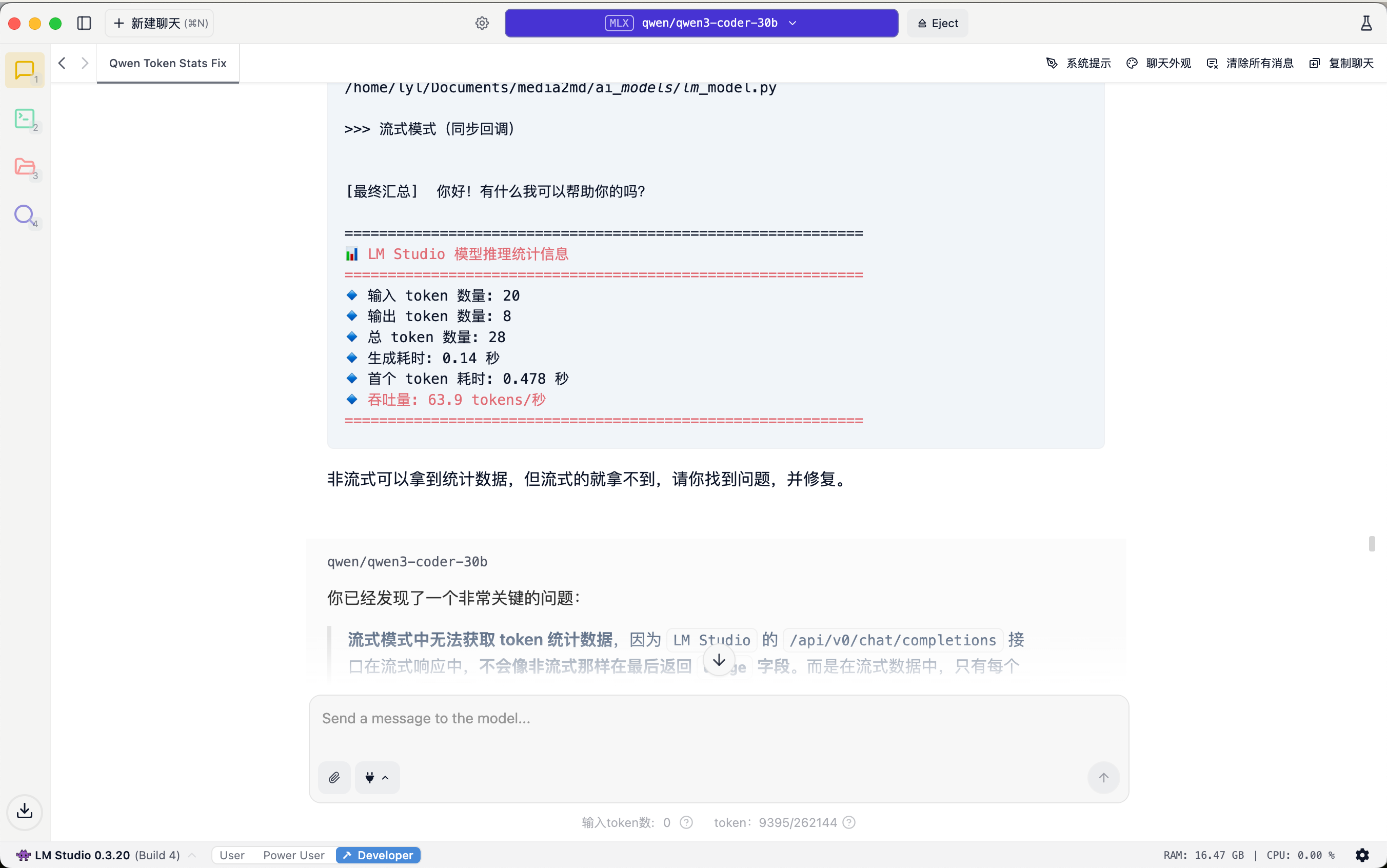 有趣的是,我把之前的一个openai格式的模型代码和LM的访问文档喂给qwen3-coder,它也确实写了一个勉强能跑的代码,但对于流式输出的token统计一直无法正确输出,哪怕给了报错信息都改不对。而同样的提示词,我喂给了sonnet4,一次性就改对了,只能说,本地量化版,目前对于代码生成,还只能处理一点简单任务,如果不是不让联网,最好还是别用本地小模型。
