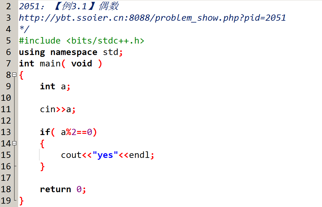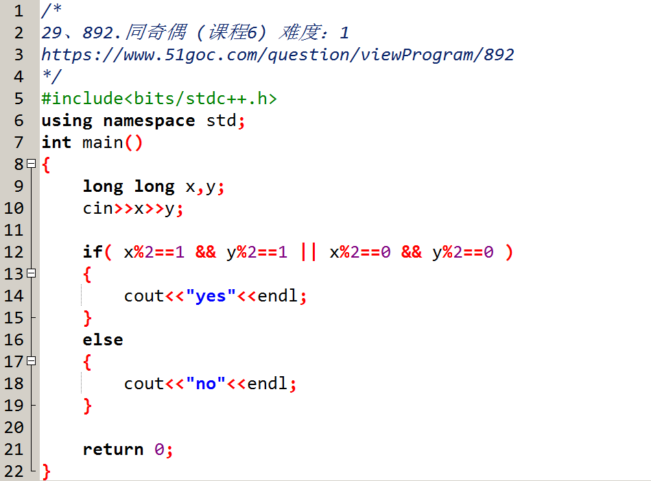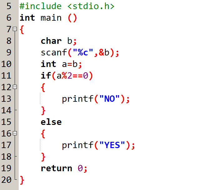 讯享网/* 1.4编程基础之逻辑表达式与条件分支 04 奇偶ASCII值判断 http://noi.openjudge.cn/ch0104/04/ */ #include<iostream> using namespace std; int main(void) { char ch; ch=getchar(); if( ch%2==1 ) { cout<<"YES"<<endl; } else { cout<<"NO"<<endl; } return 0; }