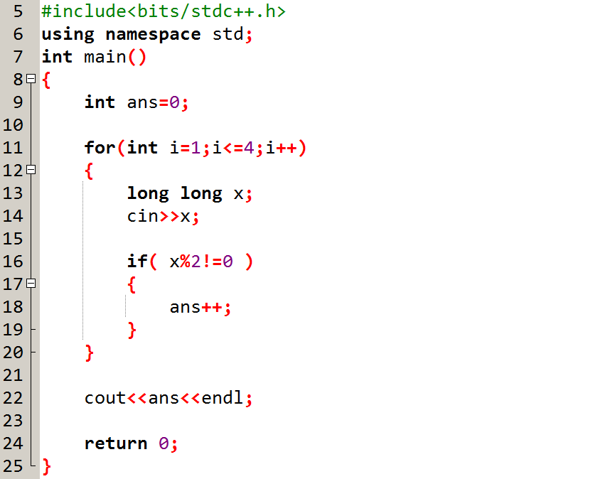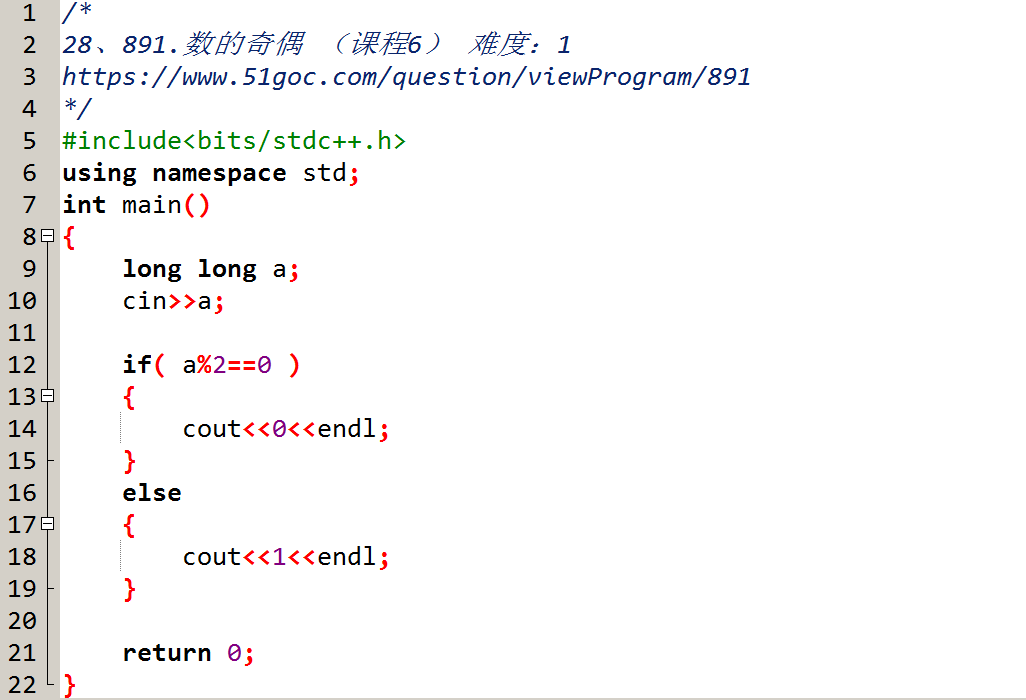 /* 1.4编程基础之逻辑表达式与条件分支 03 奇偶数判断 http://noi.openjudge.cn/ch0104/03/ */ #include <stdio.h> #include <stdlib.h> int main() { int m; //输入仅一行,一个大于零的正整数n。 scanf("%d",&m); //输出仅一行,如果n是奇数,输出odd;如果n是偶数,输出even。 if(m%2==0) { printf("even\n"); } else { printf("odd\n"); } return 0; }