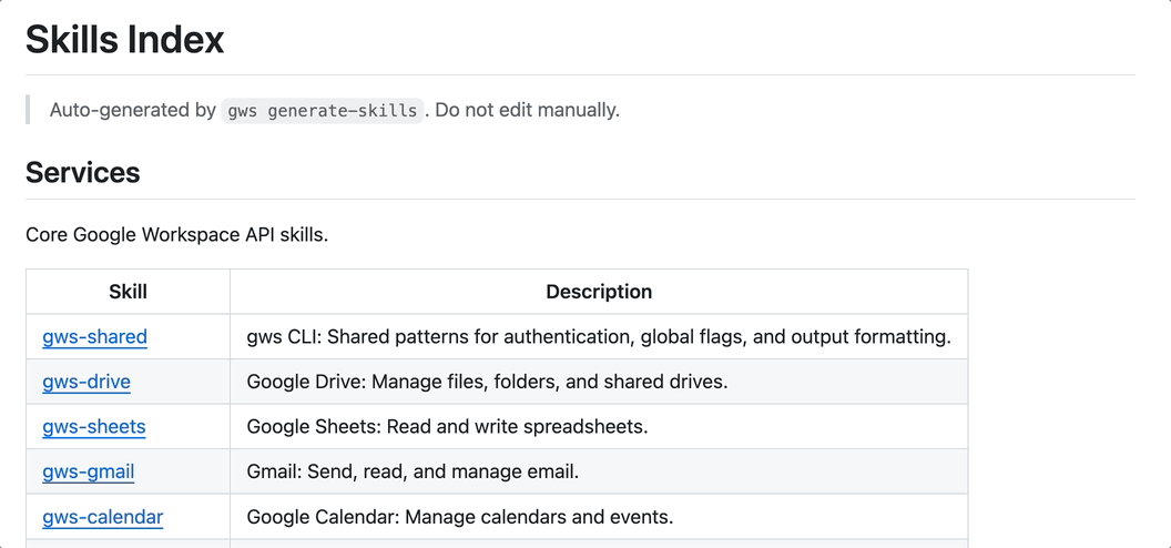 地址:https://github.com/googleworkspace/cli/blob/main/docs/skills.md