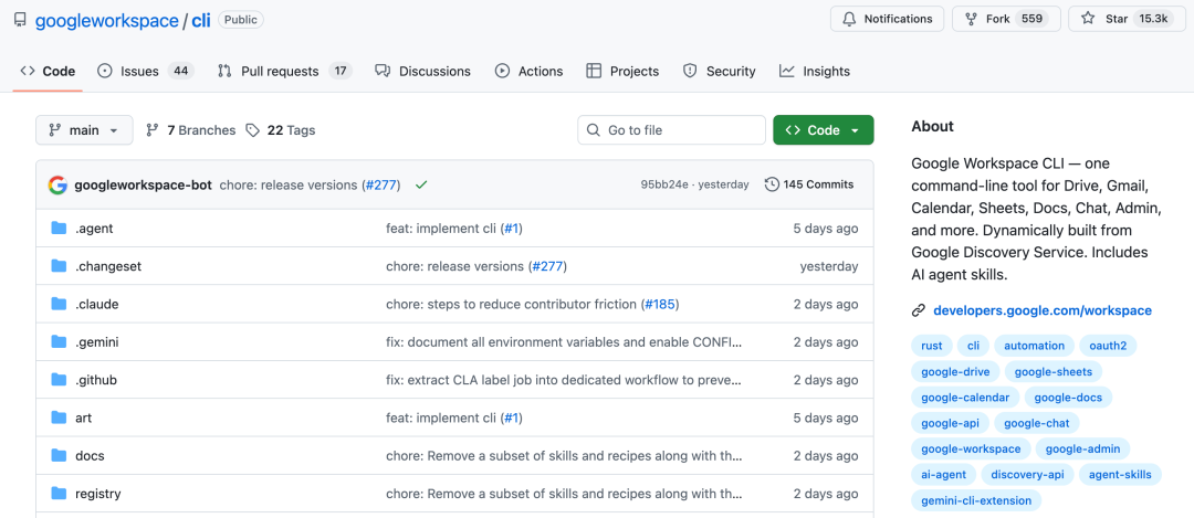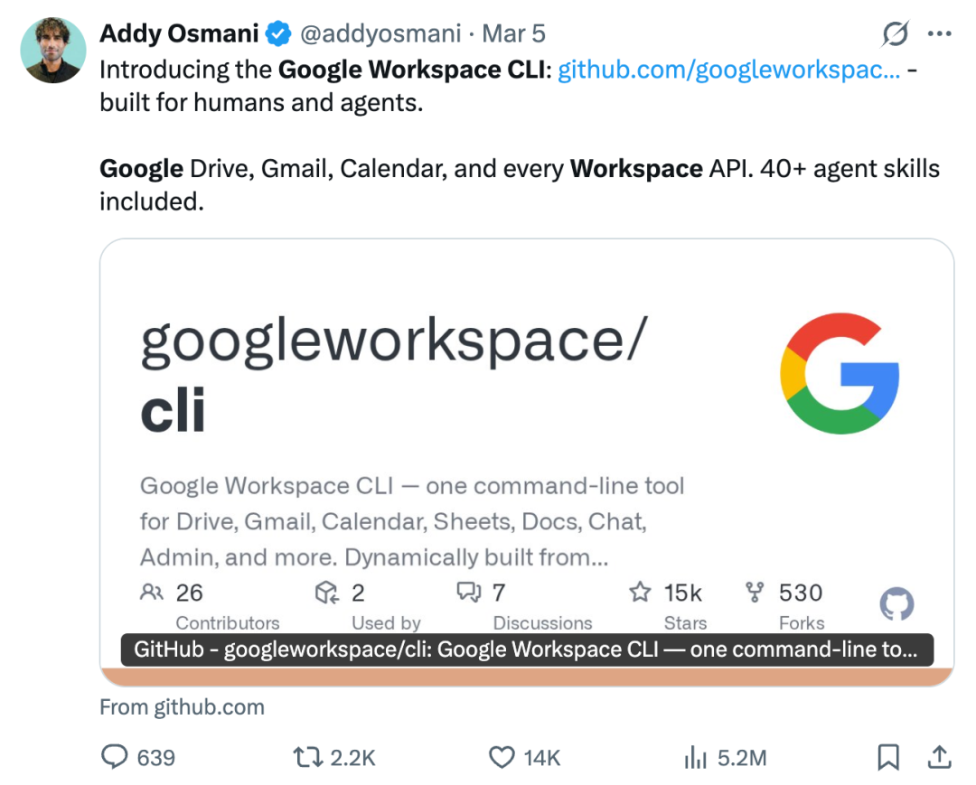 这意味着,该 CLI 将 Google Workspace API 变成了一个既适合人类,也适合 AI Agent 调用的统一接口。人类不用写 API 请求,AI 不需要写额外工具。