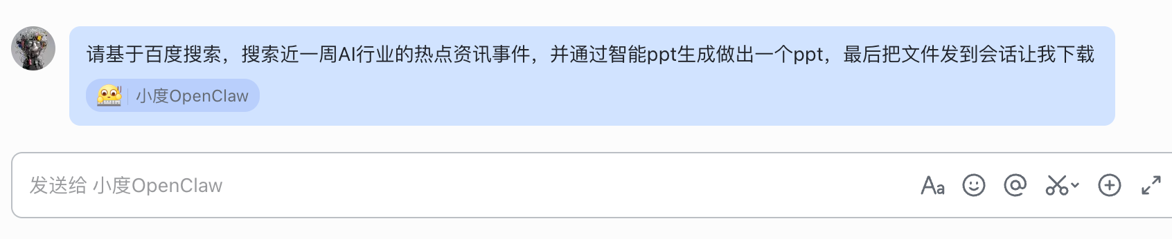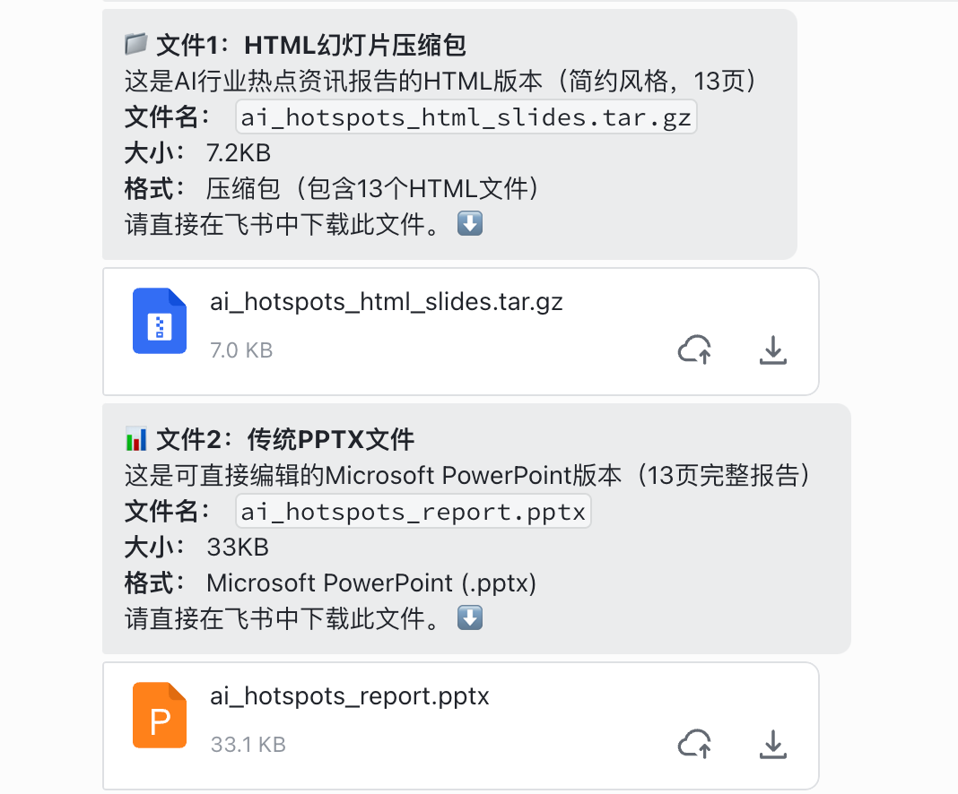 让他使用百度搜索和智能 PPT 这两个 Skill,生成一份 AI 行业热点事件 PPT。