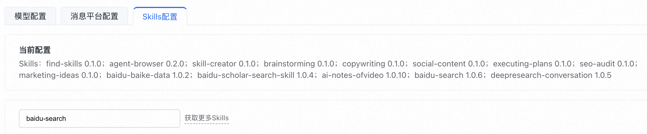 | Skills | 技能 | 智能体技能管理。 | 启用或者禁用技能,设置 API Key。 |
