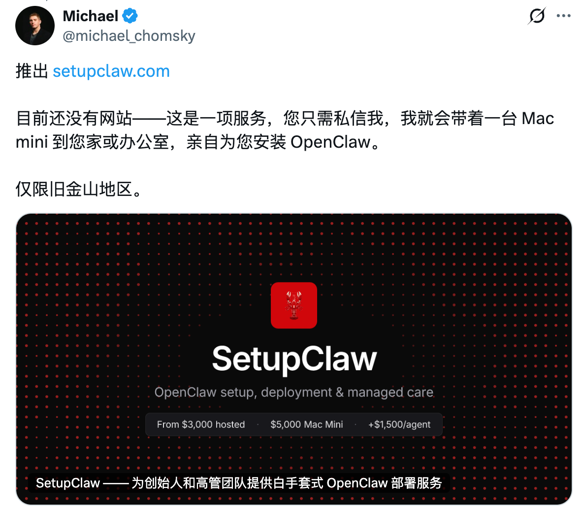 海外的代装服务明码标价,云端托管安装 3000 美元,含 Mac mini 硬件的远程配置 5000 美元,提电脑亲自上门 6000 美元。