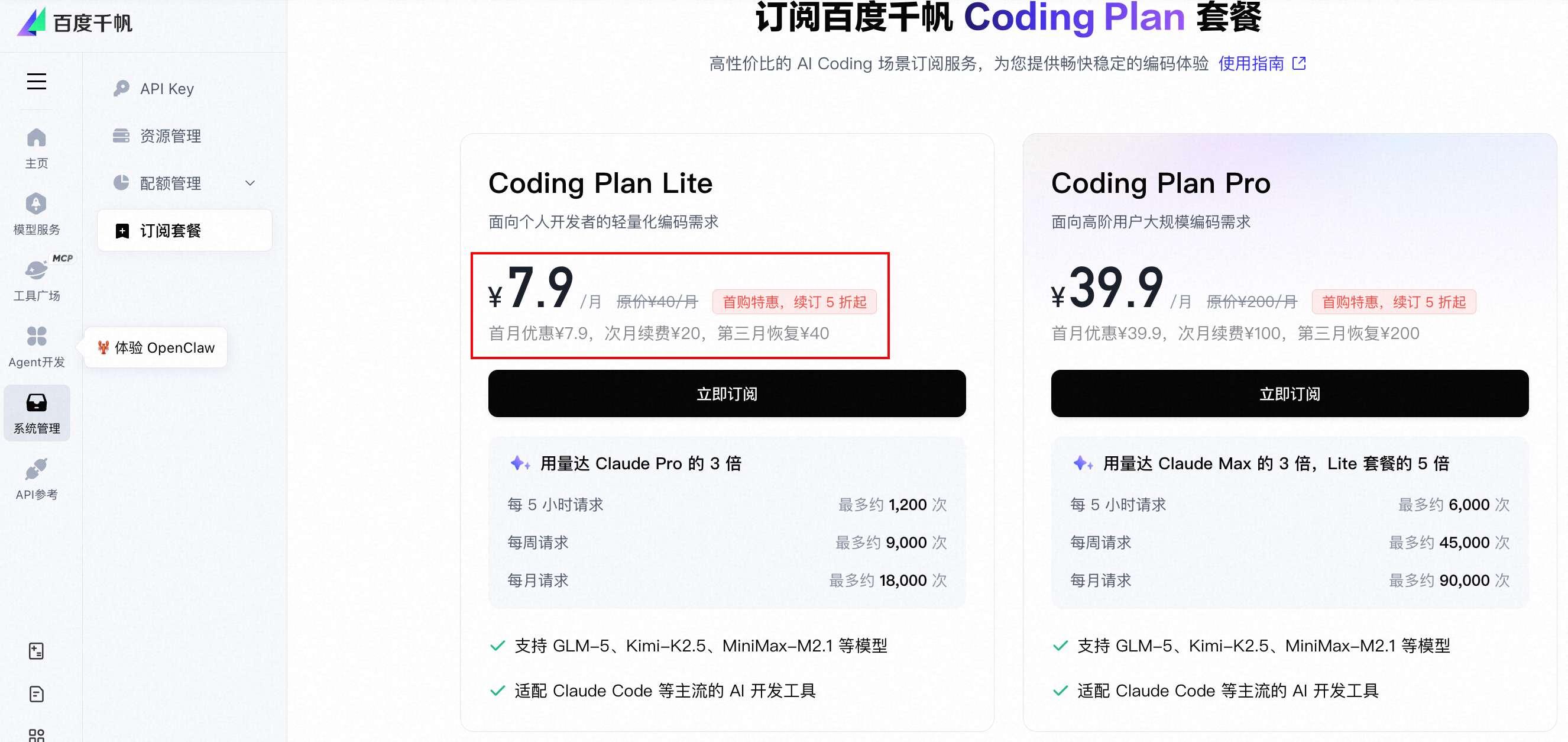 饲料是百度千帆的 Coding Plan,地址放图片下面了。