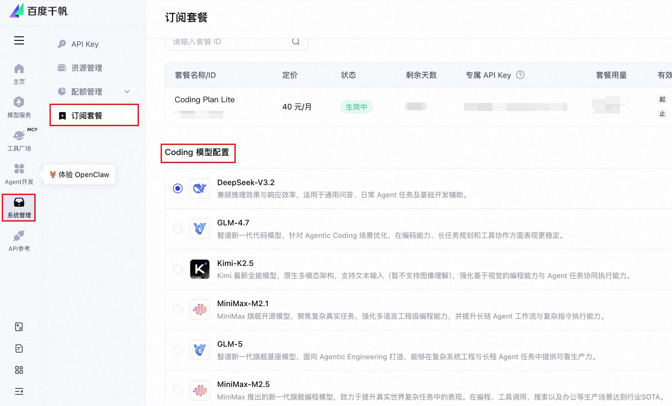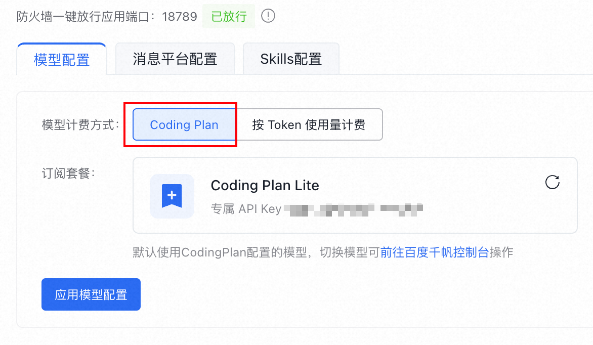 在模型配置这里,之前采购的饲料 Coding Plan 会默认选中。