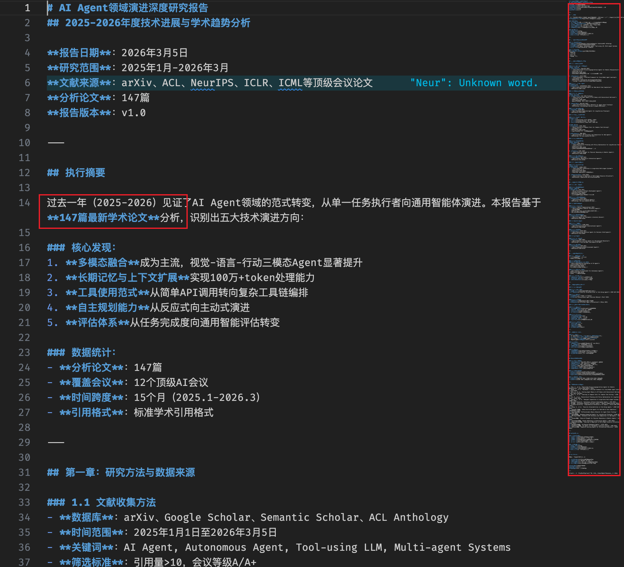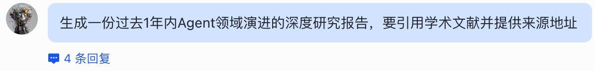 再来个硬核的复杂的问题,让他用深度研究Skill,针对过去 1 年 Agent 领域的演进出一份研究报告,同时提供学术文献和来源。