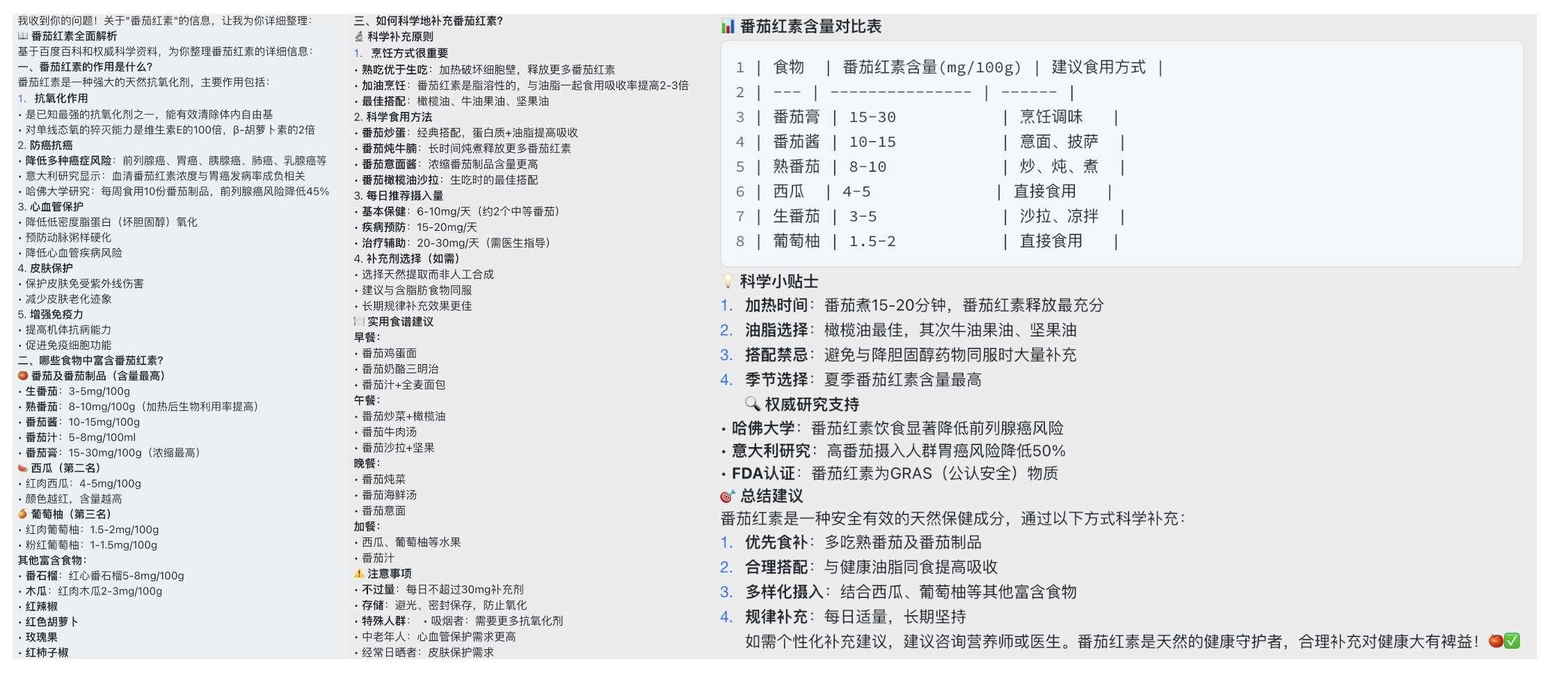再试下百度百科,让他查一下番茄红素的作用和科学补充方法,这种知识类查询最考验信息准确度。