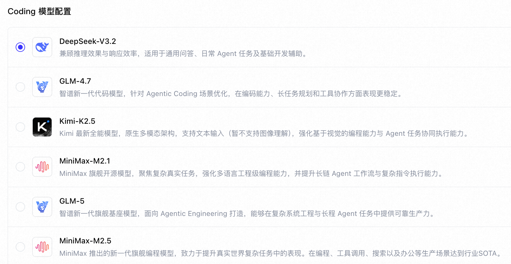 DeepSeek-V3.2、GLM-4.7、Kimi-K2.5、MiniMax-M2.5、GLM-5,想用哪个用哪个。