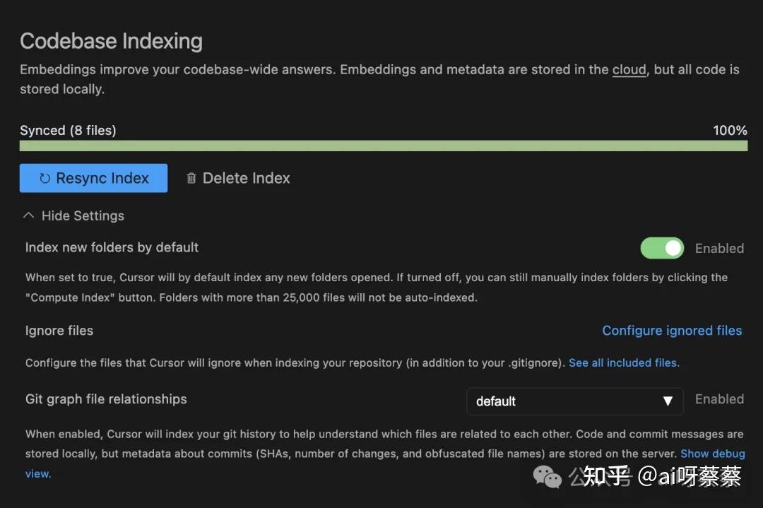 在【Codebase Indexing】这里,是可以设置 Ignore files 的,这样 Cursor 在索引项目代码时就会忽略这些问题,这就是前面提到的通过限制上下文范围,减少计算资源的消耗,进而降低内存和 CPU 的使用,从而提高索引或查询的速度。