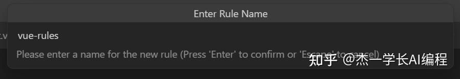 当我们点击 Add New Rule后,先输入规则的名称,比如命名为:vue-rules,约束AI在编写Vue项目的规范。也可以通过快捷键 Cmd + Shift + P ,输入 New Cursor Rule 来快速打开下面的对话框。
