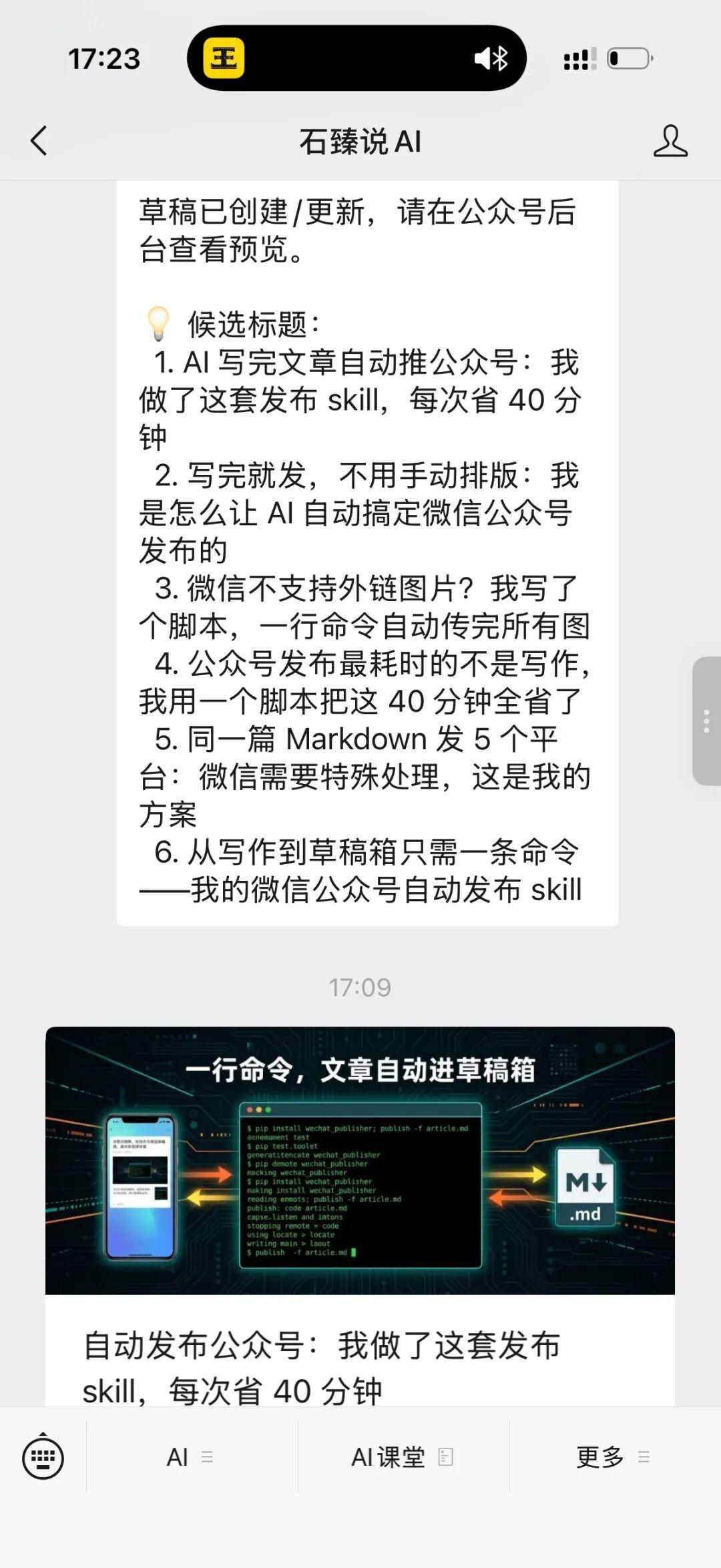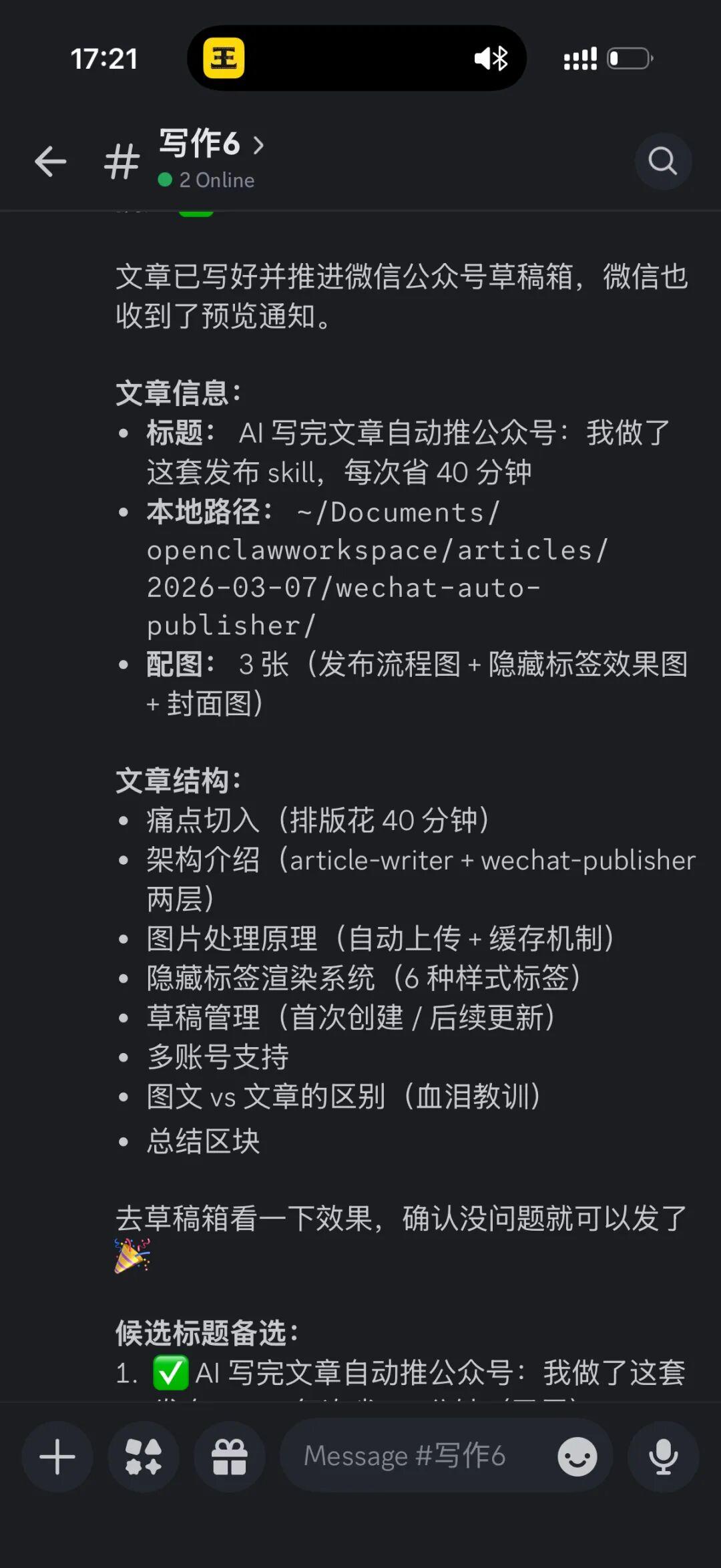 这套系统目前运行在我的 Ubuntu 服务器上,通过 OpenClaw 调度。AI 写完文章后自动推到草稿箱,我审核没问题就直接发。