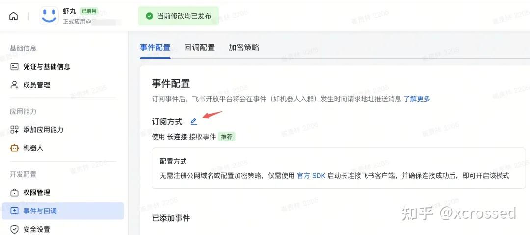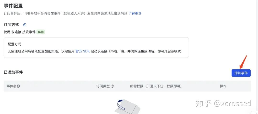 在“事件与回调”中设置“事件配置”订阅方式为“长连接”,并添加「接收消息」订阅事件。