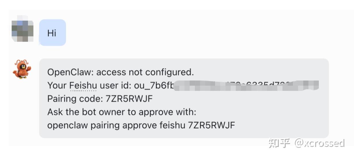 OpenClaw: access not configured. Your Feishu user id: ou_7bxxxxxxx Pairing code: 7ZR5RWJF Ask the bot owner to approve with: openclaw pairing approve feishu 7ZR5RWJF