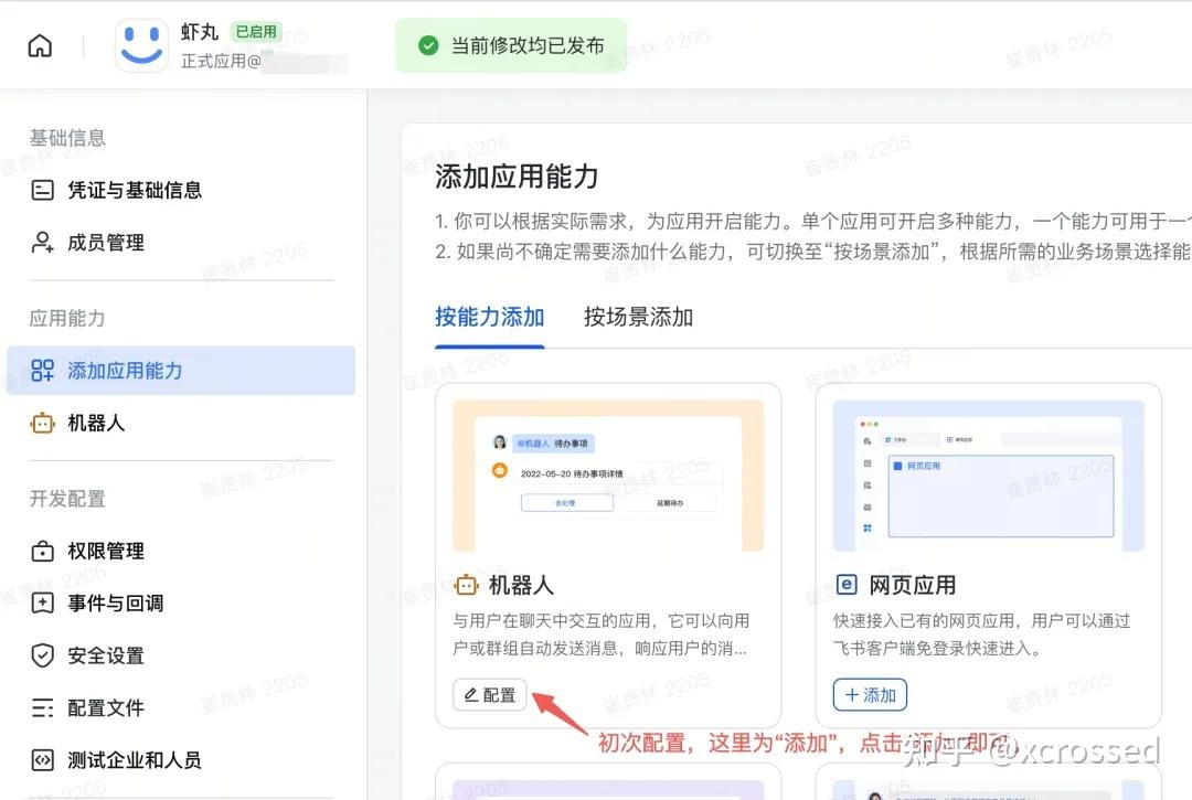 找到「应用能力」—>「添加应用能力」—>「按能力添加」—>选择【机器人】能力点击配置