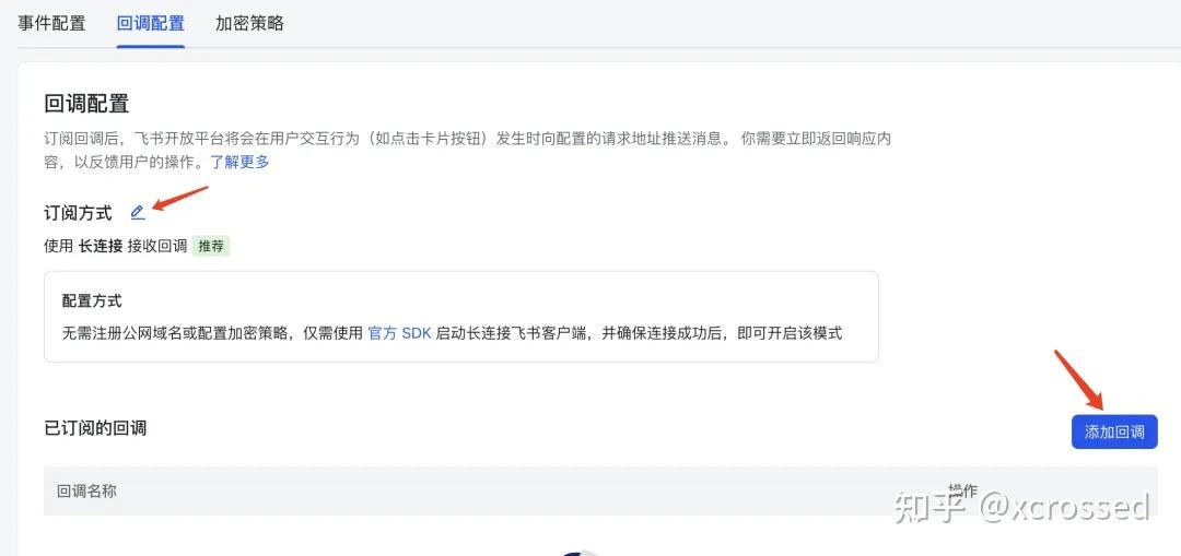 配置右侧的“回调配置” Tab,也设置为长连接,并添加回调“卡片回传交互”。