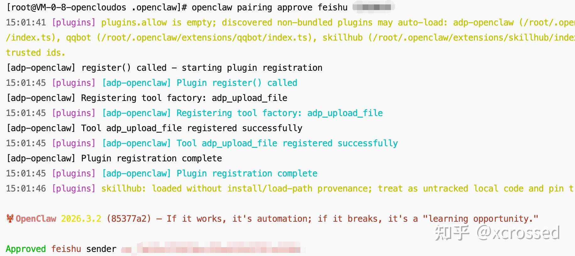 出现上图类似 Approved feishu sender ou_xxxx 就成功了