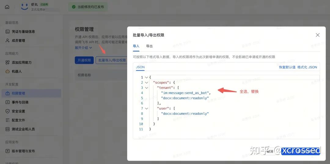 "tenant": [ "application:bot.menu:write", "calendar:timeoff", "cardkit:card:write", "contact:contact.base:readonly", "contact:user.base:readonly", "directory:employee.base.background_image:read", "docs:document:import", "im:chat", "im:chat.access_event.bot_p2p_chat:read", "im:chat.announcement:read", "im:chat.announcement:write_only", "im:chat.managers:write_only", "im:chat.members:bot_access", "im:chat.members:read", "im:chat.members:write_only", "im:chat.menu_tree:read", "im:chat.menu_tree:write_only", "im:chat.moderation:read", "im:chat.tabs:read", "im:chat.tabs:write_only", "im:chat.top_notice:write_only", "im:chat.widgets:read", "im:chat.widgets:write_only", "im:chat:create", "im:chat:delete", "im:chat:moderation:write_only", "im:chat:operate_as_owner", "im:chat:read", "im:chat:readonly", "im:chat:update", "im:message", "im:message.group_at_msg:readonly", "im:message.group_msg", "im:message.p2p_msg:readonly", "im:message.pins:read", "im:message.pins:write_only", "im:message.reactions:read", "im:message.reactions:write_only", "im:message.urgent", "im:message.urgent.status:write", "im:message:readonly", "im:message:recall", "im:message:send_as_bot", "im:message:send_multi_depts", "im:message:send_multi_users", "im:message:send_sys_msg", "im:message:update", "im:resource", "im:url_preview.update", "im:user_agent:read", "optical_char_recognition:image" ], "user": [ "directory:employee.base.background_image:read", "docs:document:import", "im:chat", "im:chat.access_event.bot_p2p_chat:read", "im:chat.announcement:read", "im:chat.announcement:write_only", "im:chat.managers:write_only", "im:chat.members:read", "im:chat.members:write_only", "im:chat.moderation:read", "im:chat.tabs:read", "im:chat.tabs:write_only", "im:chat.top_notice:write_only", "im:chat:delete", "im:chat:moderation:write_only", "im:chat:read", "im:chat:readonly", "im:chat:update", "im:message", "im:message.pins:read", "im:message.pins:write_only", "im:message.reactions:read", "im:message.reactions:write_only", "im:message.urgent.status:write", "im:message:readonly", "im:message:recall", "im:message:update" ]