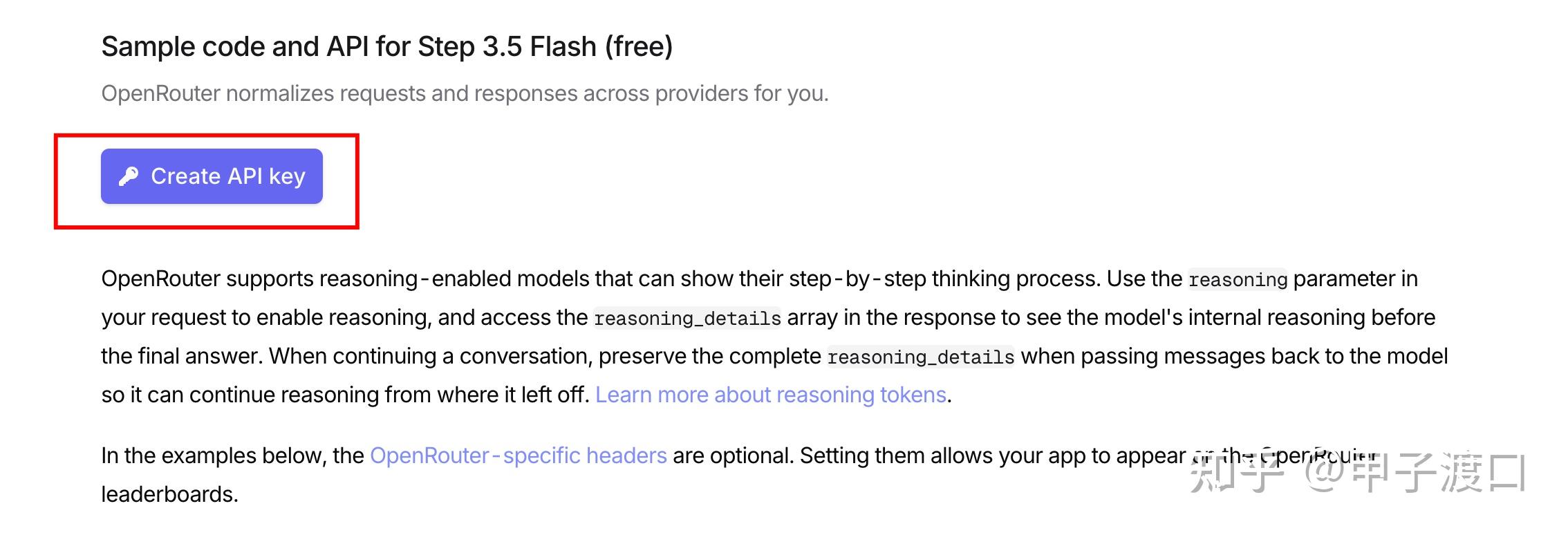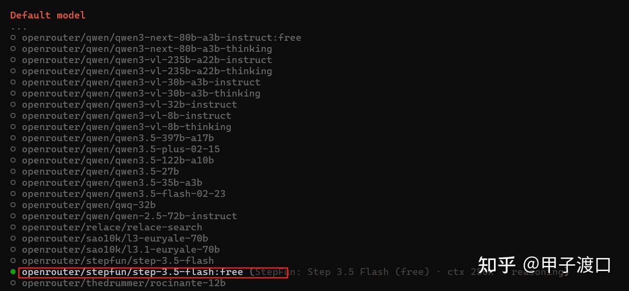 这时会给你弹出一个 API key,复制下来,粘贴到终端填 API key 的页面就行了,按回车确认。然后按下键选择模型(得按好一会儿),选择 stepfun-3.5-flash:free,按回车确认。