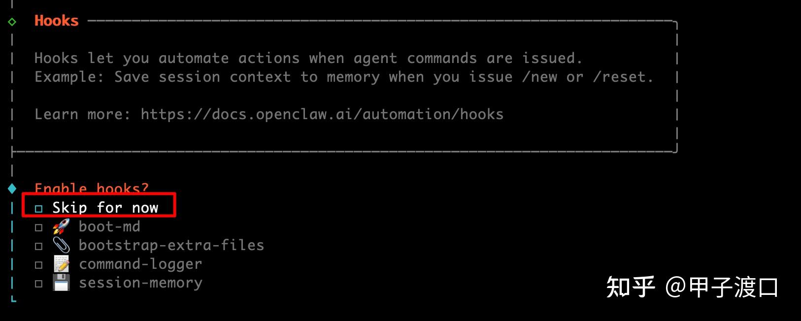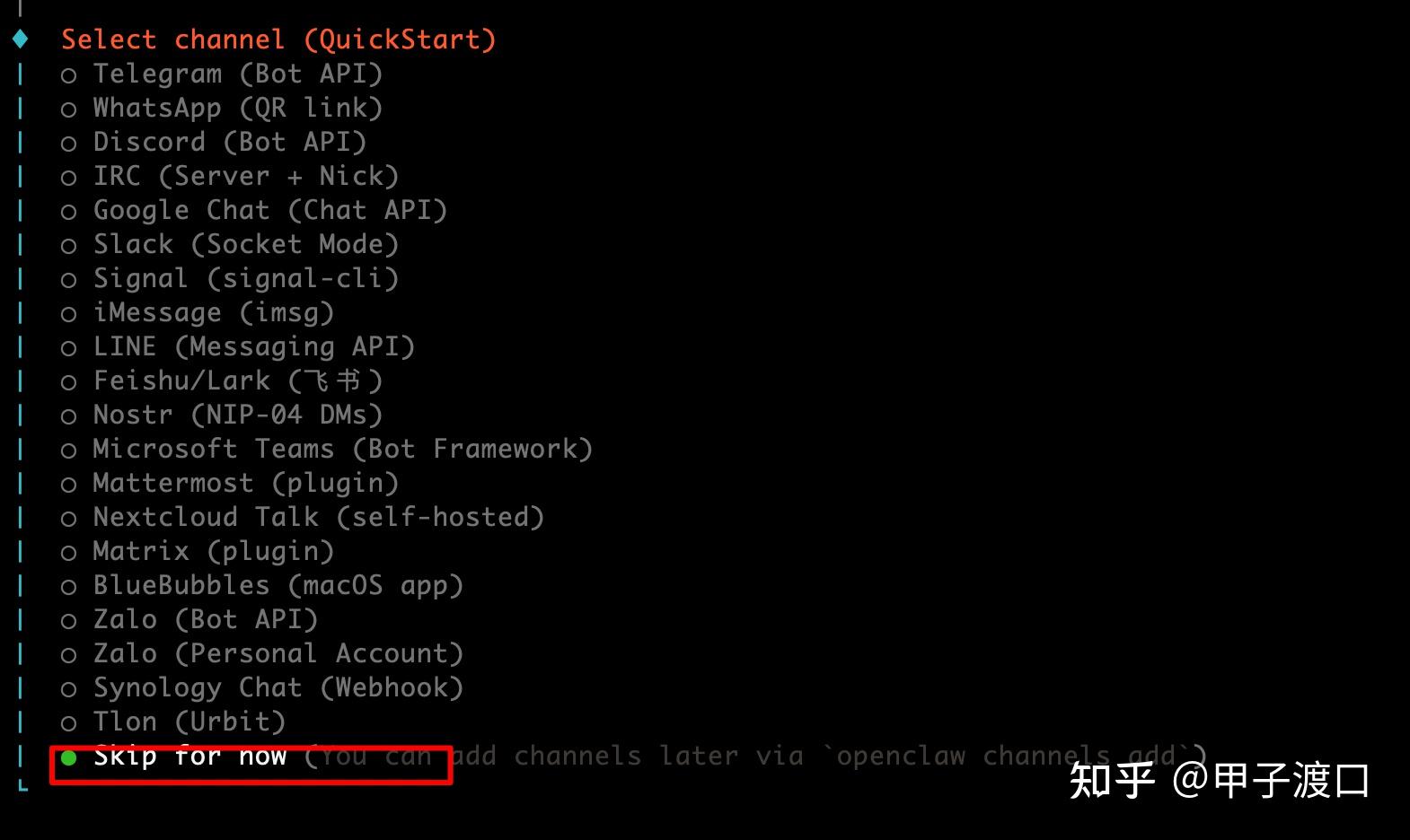第三步,选择通讯渠道,这里可以选飞书或者其他通讯工具,但是 最简单,由于 MAC 还没有 更更新 ,所以我们先不选。按方向键滑到最下面,选择跳过。