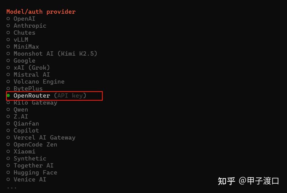 第二步是选择模型,按上下键选择 OpenRouter ,这是一个统一的AI大模型聚合平台与API网关。然后按回车键进入配置 API key。