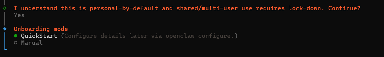 第一步是选择配置模式,小白直接选 QuicStart 模式就行了。上下键选择,回车键确认。