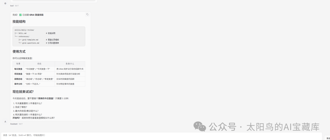 创建一个每日复盘的Skill 【简介】GRAI复盘法通过目标回顾、结果评估、原因分析和规律总结四个环节,系统化梳理经验,适用于需要深度分析的项目或事件复盘。 【使用场景】项目复盘、季度总结、个人成长回顾、大型活动复盘。 【核心步骤】 1. Goal(目标回顾):明确最初设定的目标,判断是否偏离或达成。2. Result(结果评估):对比实际结果与目标,分析亮点与不足。3. Analysis(原因分析):从流程、规则、执行等角度剖析成功或失败的主客观因素。 4. Insight(规律总结):提炼可复用的方法论,制定改进计划。