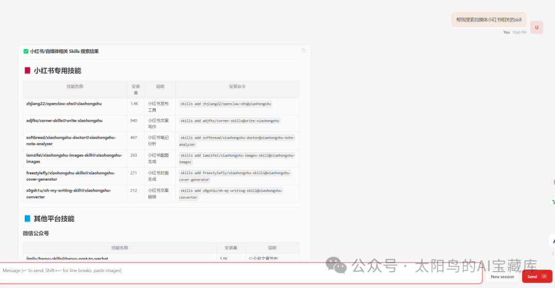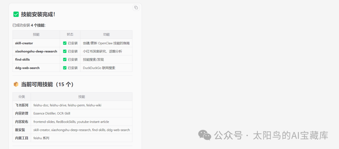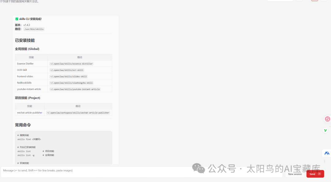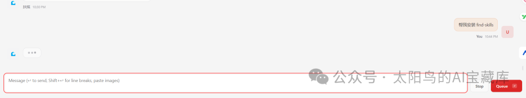安装完find-skills,其它skills都可以和助理沟通,让他来安装。