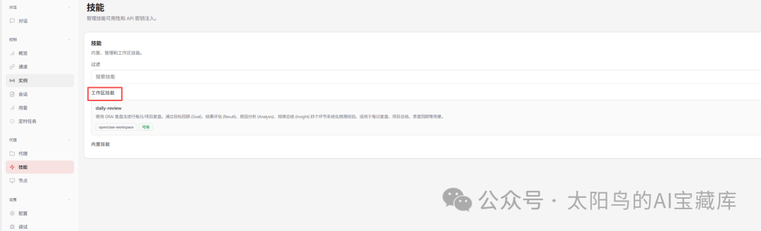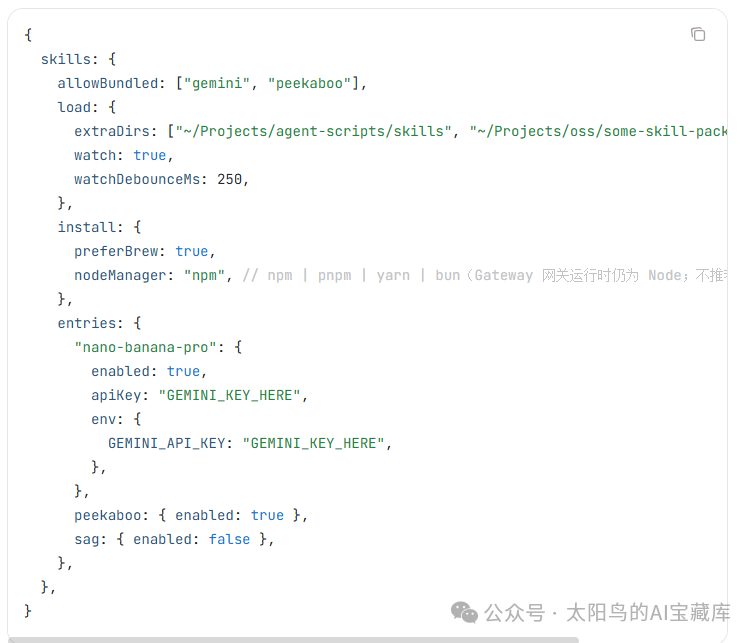 OpenClaw 所有 Skills 相关配置都位于 /.openclaw/openclaw.json 中的 skills 下。
