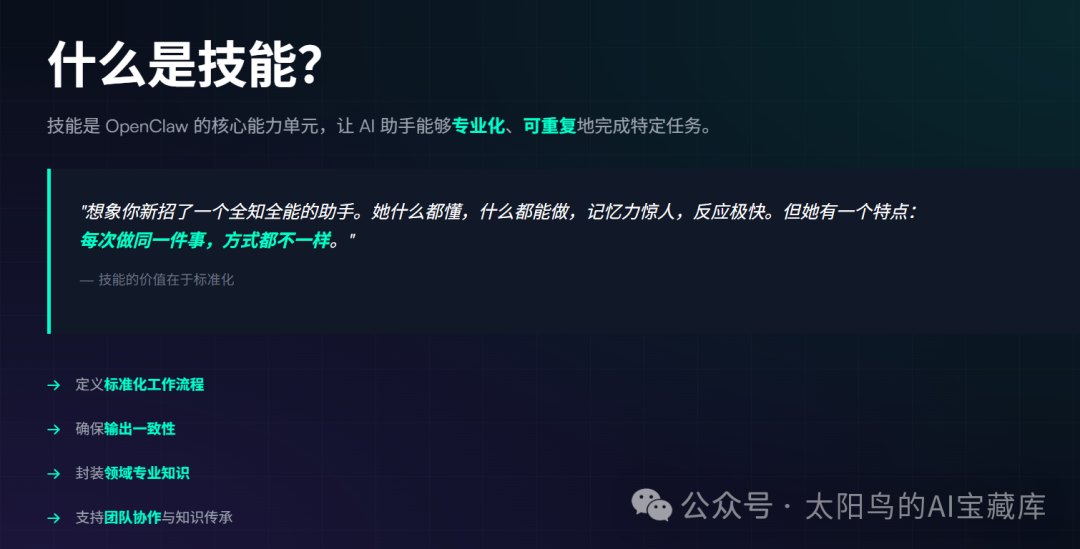 技能教 OpenClaw 如何以可重复的方式完成特定任务,无论是根据公司品牌指南创建文档,利用组织特定工作流程分析数据,还是自动化个人任务。