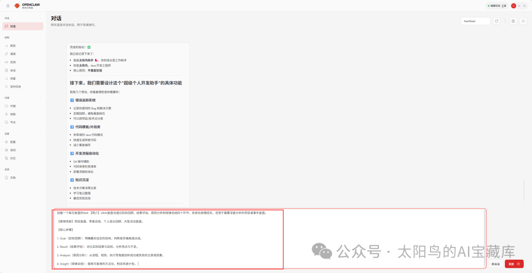 - HEARTBEAT(监控心跳检测):Heartbeat 机制, 周期性检查,比如我设置让它1小时搜索下新闻,并总结好发我。