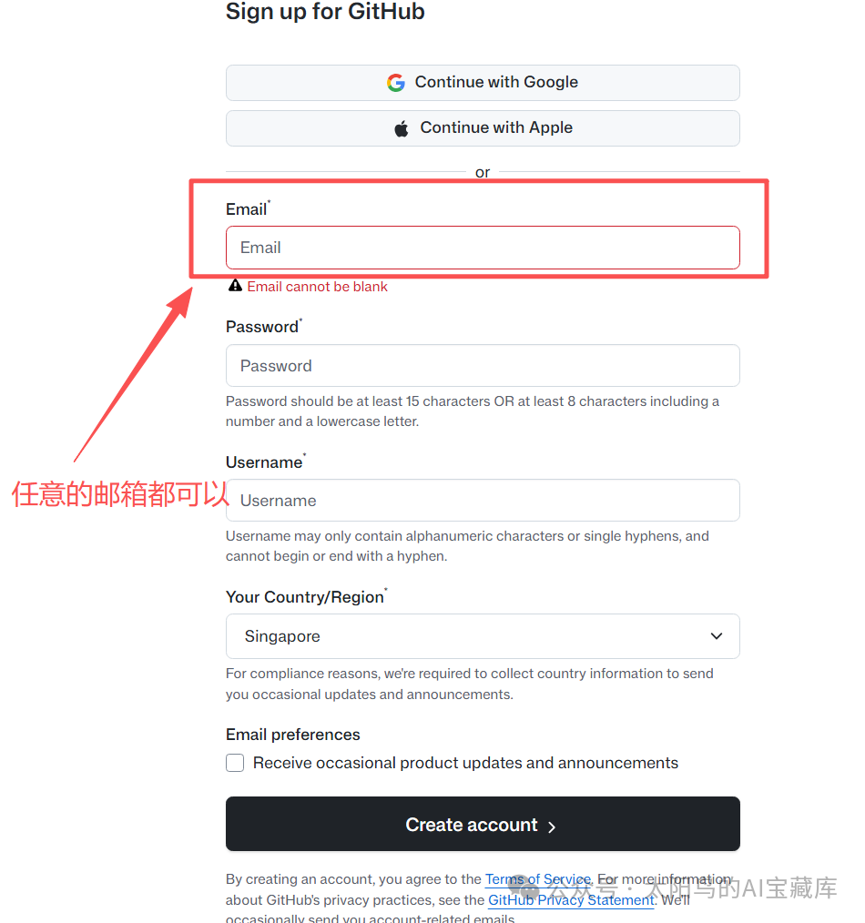 输入你自己任意邮箱都可以,然后输入密码和用户名。
