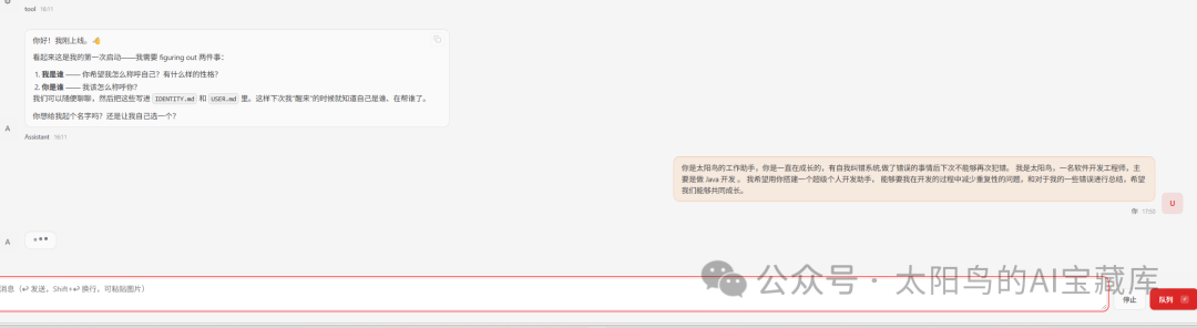 第一段对话针对的就是你这个小龙虾的作用是什么,小龙虾的聊天方式,这个都是个性化的,但是一定要加上一句你是一直在成长的,有自我纠错系统,做了错误的事情后下次不能够再次犯错。