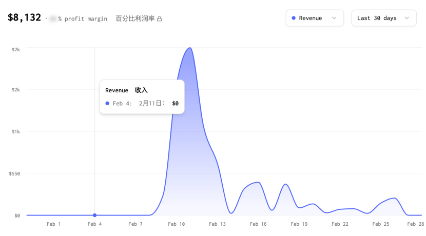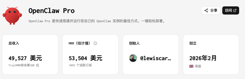 它主打“手机30秒部署OpenClaw”,在某一周流量爆发期内迅速起量。过去30天收入约8132美元。