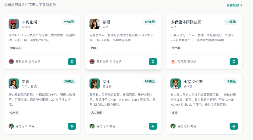 简单来说,用户不需要懂提示词工程,可以直接在上面花费(通常几十个一个)购买经过实战检验的AI配置文件、工作流程指南,甚至是预设好的性格和技能的“数字员工”。