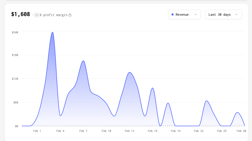 ClawdHost为Clawdbot、Moltbot和OpenClaw提供托管服务。过去30天收入1608美元,且下滑明显。过去10天收入仅约140美元。