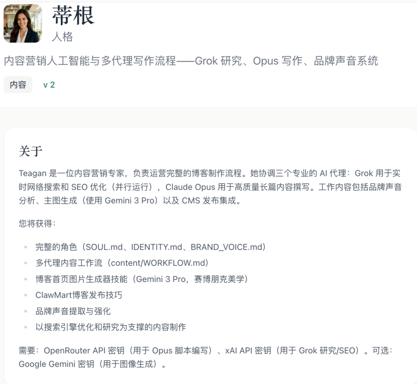 她背后调度的是三个模型——Grok负责实时搜索与SEO优化,Claude Opus负责长文写作,Gemini负责主图生成。再加上,品牌声音体系与CMS发布集成,一篇博客从选题、研究、写作到上线,被打包成一个可复制的流程。