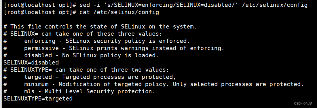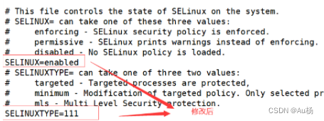 sed -ri -e 's/SELINUX=disabled/SELINUX=enabled/' /etc/selinux/config -e 's/SELINUXTYPE=targeted/SELINUXTYPE=111/' /etc/selinux/config