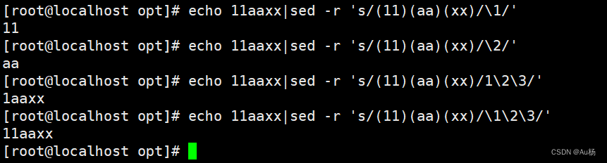 [root@localhost opt]# echo 11aaxx|sed -r 's/(11)(aa)(xx)/\1\2\3/'