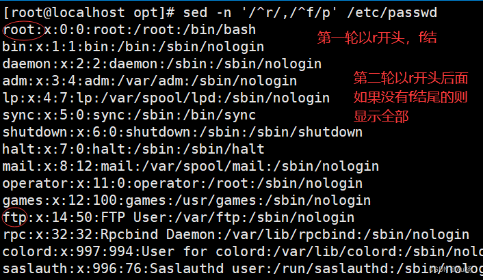 [root@localhost opt]# sed -n '/^r/,/^f/p' /etc/passwd