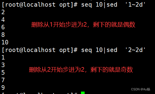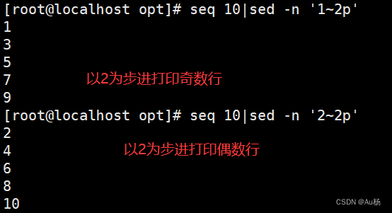 [root@localhost opt]# seq 10|sed -n '2~2p'