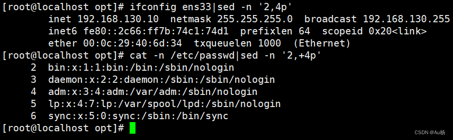 [root@localhost opt]# ifconfig ens33|sed -n '2,4p'