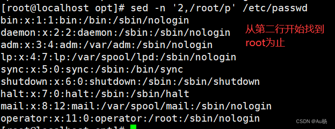 [root@localhost opt]# sed -n '2,/root/p' /etc/passwd