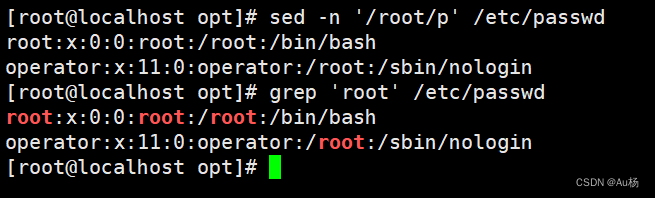 [root@localhost opt]# sed -n '/root/p' /etc/passwd