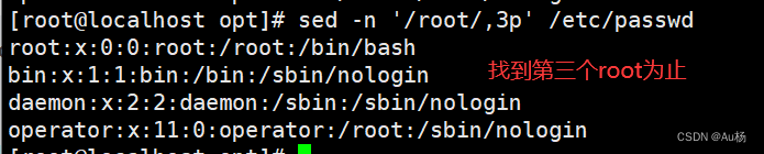[root@localhost opt]# sed -n '/root/,3p' /etc/passwd